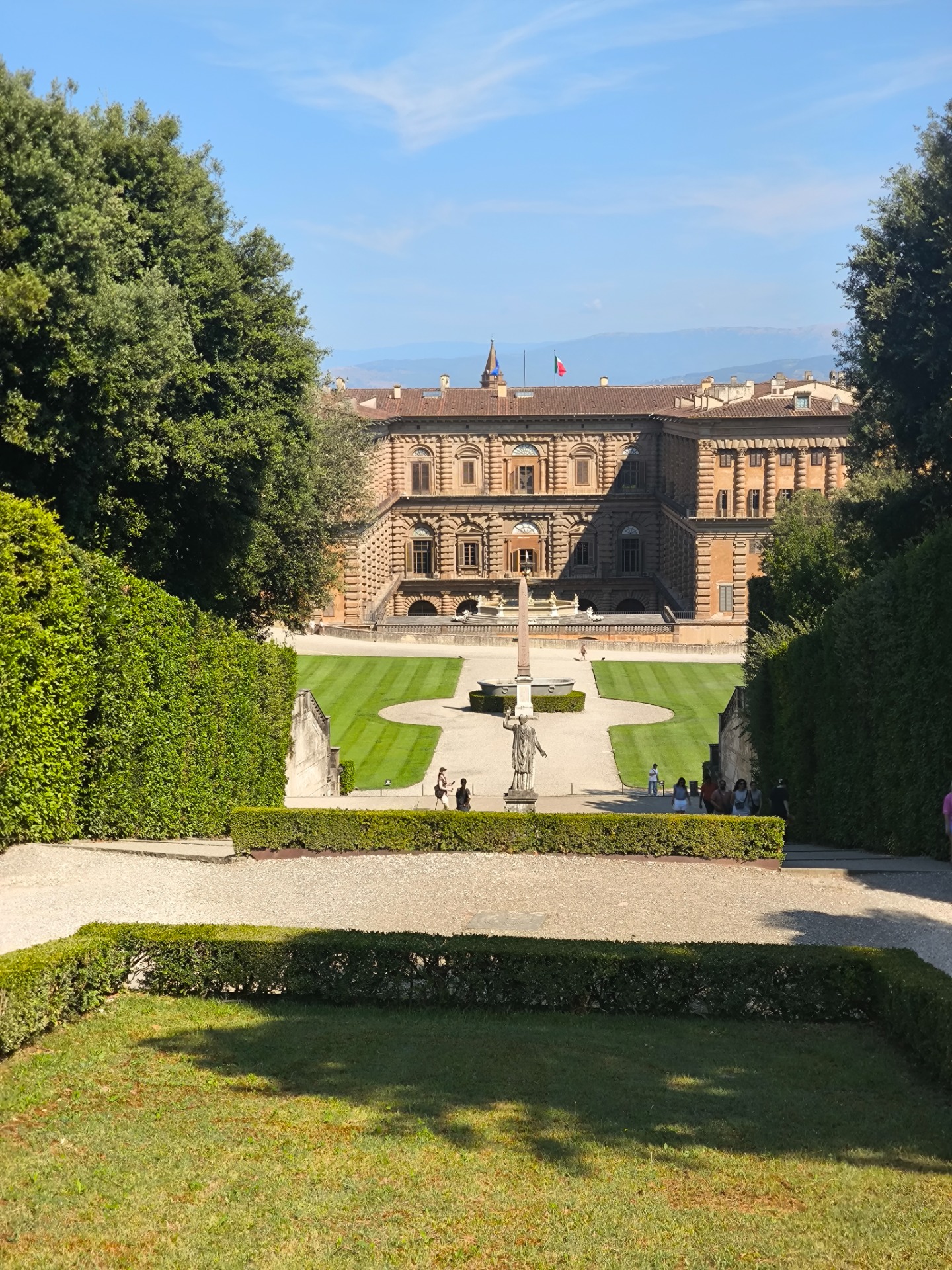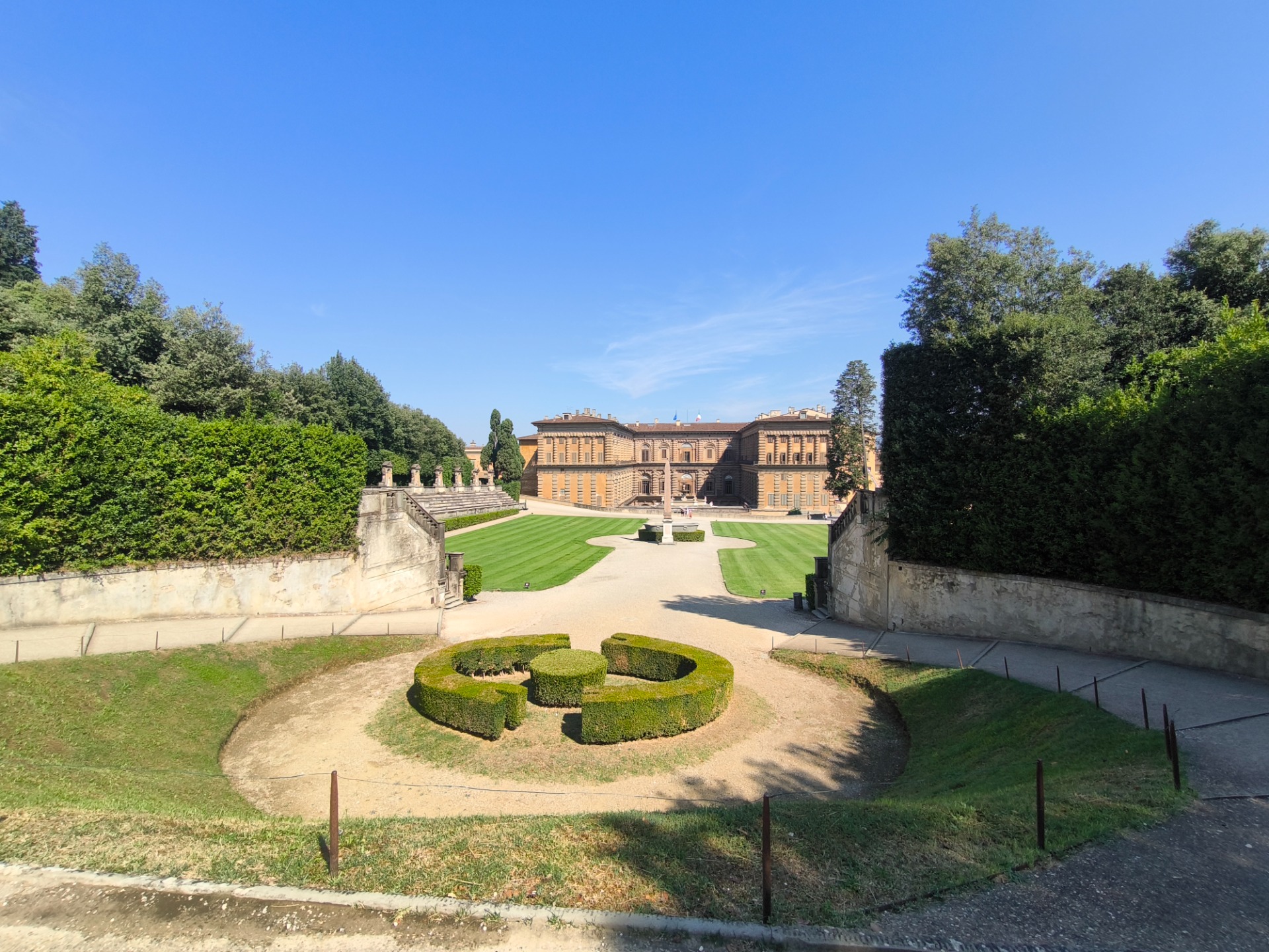 Sarayın arka cephesinin merkezinde yer alan ana eksen, Boboli Tepesi'nde derin bir amfiteatrdan yükselir ; şekli klasik bir hipodromun veya yarış pistinin yarısına benzer. Amfiteatrın merkezinde ve konumuna göre oldukça küçük kalan, Roma'daki Villa Medici'den getirilen Antik Mısır Boboli dikilitaşı bulunur. Bu ana eksen, Neptün çeşmesinde (saygısız Floransalılar tarafından Neptün'ün üç dişli mızrağı nedeniyle "Çatal Çeşmesi" olarak bilinir) son bulur ; Stoldo Lorenzi'nin Neptün heykeli , ziyaretçi yamaca tırmanırken ufuk çizgisine karşı görülebilir.