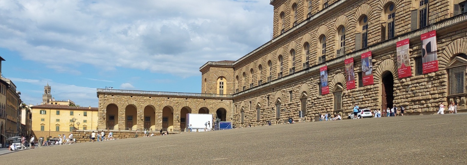 Sarayın arkasındaki Boboli tepesi arazisi bugün Boboli Bahçeleri olarak bilinen büyük parkı yaratmak için satın alındı. Medici saray peyzaj mimarı Niccola Tribolo bir sene Boboli Bahçeleri'nin üzerinde çalıştıktan sonra ölünce peyzaj Bartolommeo Ammaniti tarafından üstlenildi. Bahçelerin orijinal dizaynı sarayın arkasındaki bir amfitiyatro merkezi üzerinde merkezde toplandı. Burada canlandırıldığı kaydedilen ilk oyun 1476 yılında olup, Roma Cumhuriyeti oyun yazarı Terence'ye ait olan Andria adlı komedi türü bir oyunudur. Bunu Giovan Battista Cini gibi Floransalı oyun yazarlarının oyunları izledi. Kültürlü Medici saray maiyetinin eğlence zevki için oyunlar canlandırıldı. Onlar saray mimari Baldassarre Lanci tarafından dikkatle işlenmiş dekorlara önem verdiler.