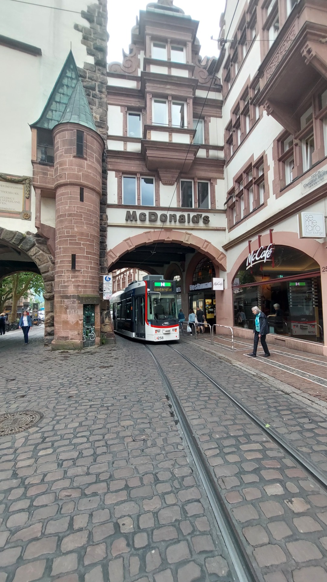 Yaklaşık 1250 yılında inşa edilen kapı kulesi, başlangıçta şehrin iç tarafına açıktı ve ancak 1547'de taş bir duvarla çevrildi. 1572'de bir merdiven kulesi eklendi; aynı yıl Matthias Schwäri, iç duvara bir tüccarın arabasıyla resmini çizdi. 19. yüzyılda bu resim, Freiburg'u satın almak için iki fıçı dolusu altınla gelen bir Svabyalı adam hakkında bir efsaneye yol açtı. Özellikle fıçıların sadece kum ve çakıl taşı içerdiği ortaya çıktıktan sonra alay konusu oldu. Ayrılmadan önce karısı, gizlice altınları değersiz bir dolgu malzemesiyle değiştirmişti.
